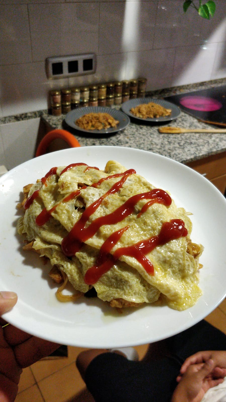 Luego emplatar y en la misma sartén se hace una tortilla francesa y se le pone por encima.